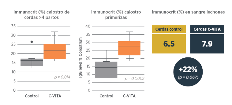 Se incorporó 1kg de C-VITA el pienso de las cerdas y se midió el nivel de inmunocrit (alta correlación entre inmunocrit y nivel de IgG) tanto en calostro como en sangre de lechones.
