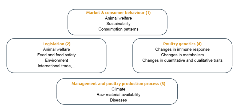 In the globalized poultry industry, challenges can be quite diverse. They can generally be grouped into 4 main categories: (1) market and consumer behavior, (2) legislation, (3) management and production process and (4) poutlry genetics (Figure 1).