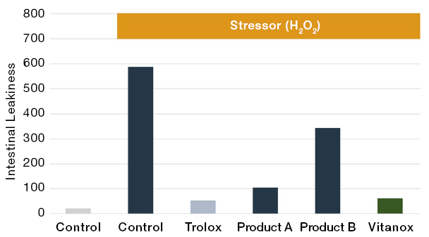 Figure 2. Vitanox prevents intestinal leakiness as observed in the Boyden Chamber of enterocytes after exposure to hydrogen peroxide as a stressor at Antwerp University (Belgium). Comparison was made with various antioxidants and Trolox as positive control (Trolox is vitamin E without its lipophilic tail, which renders it water-soluble and consequently usable in in vitro systems. Trolox is therefore not completely comparable with intact vitamin E).